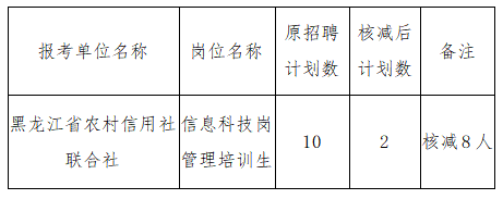 根据《黑龙江省农村信用社员工招聘公告》的相关规定,经研究,现将报名后达不到规定开考比例的部分岗位的招聘计划数核减情况公告如下: